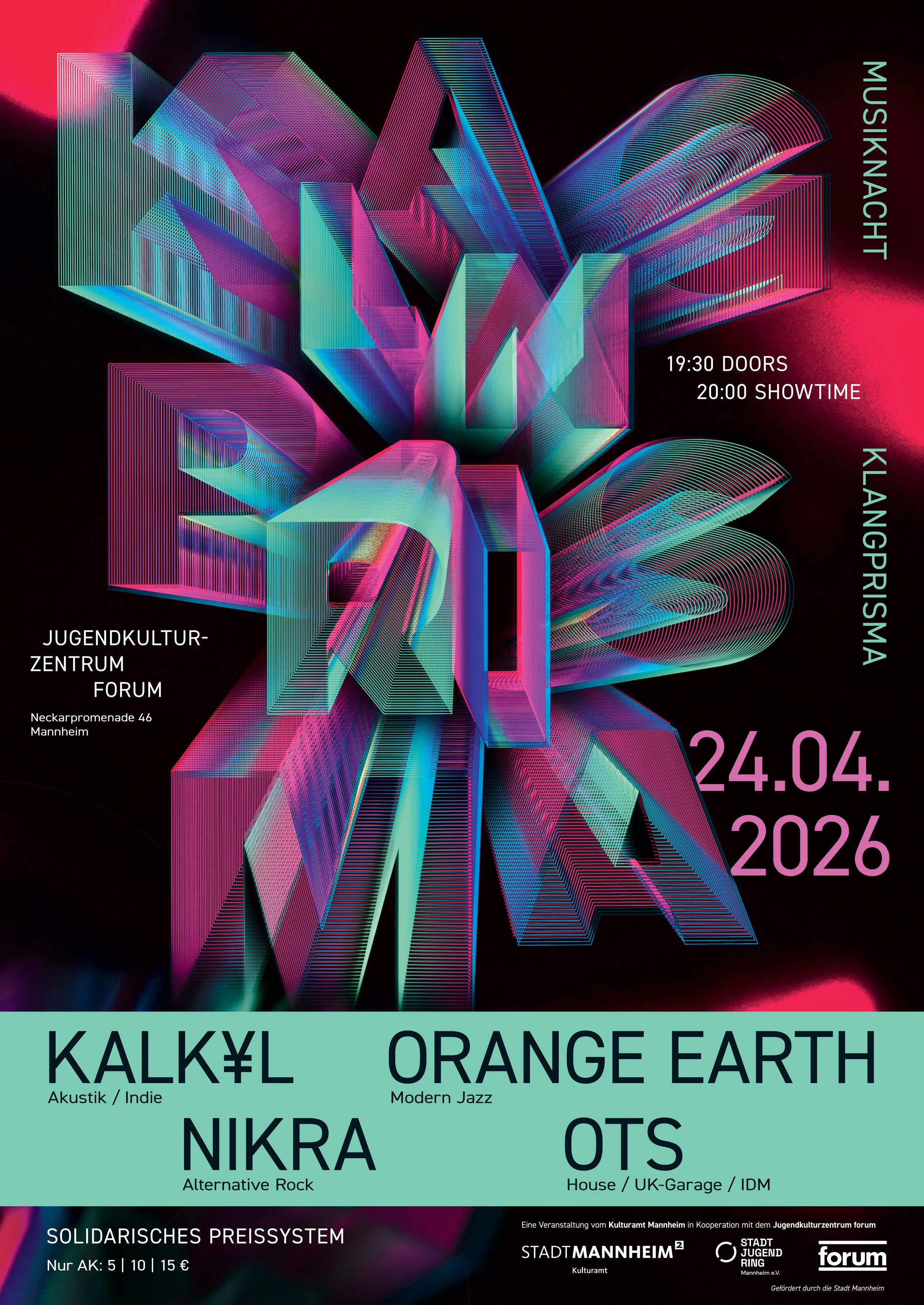 Nach dem erfolgreichen Start im Jahr 2025 möchte das Kulturamt mit der Kooperation Klangprisma auch in der aktuellen Ausgabe zwei Ziele erreichen: Zum einen sollen die Räume des Jugendkultur-zentrums forum als wichtiger Musikclub in Mannheim stärker sichtbar gemacht werden. Zum ande-ren soll die vielfältige und hochkarätige Mannheimer Musikszene präsentiert werden.