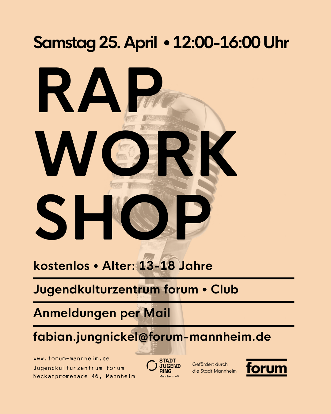 Dann komm zum offenen Rap Workshop. Wir vermitteln Basics zu Songwriting, verschiedenen Flows und geben dir Tipps und Tricks zum Rappen mit. Es gibt jede Menge Raum zum Austauschen und Ausprobieren. Vorkenntnisse sind nicht notwendig. Der Workshop ist kostenlos.