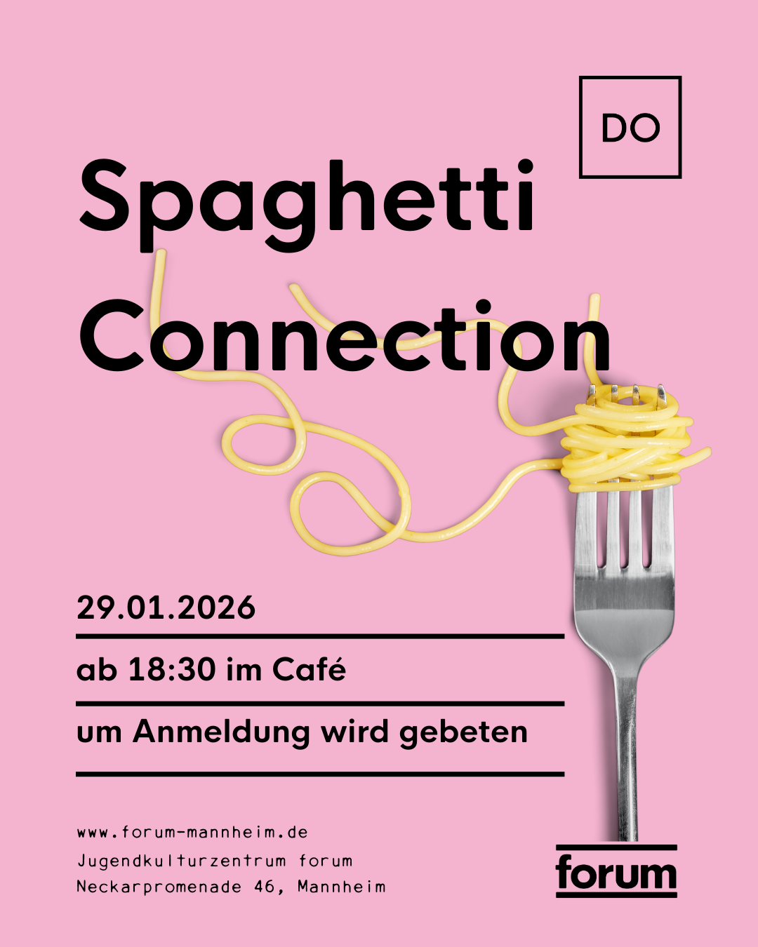 Am 29. Januar 2026 ab 18:30 Uhr im forum-Café wollen wir zusammenkommen und uns gegenseitig inspirieren. Lasst uns bei einem leckeren Pasta-Gericht ins Gespräch kommen, Ideen austauschen und einen entspannten Abend genießen.